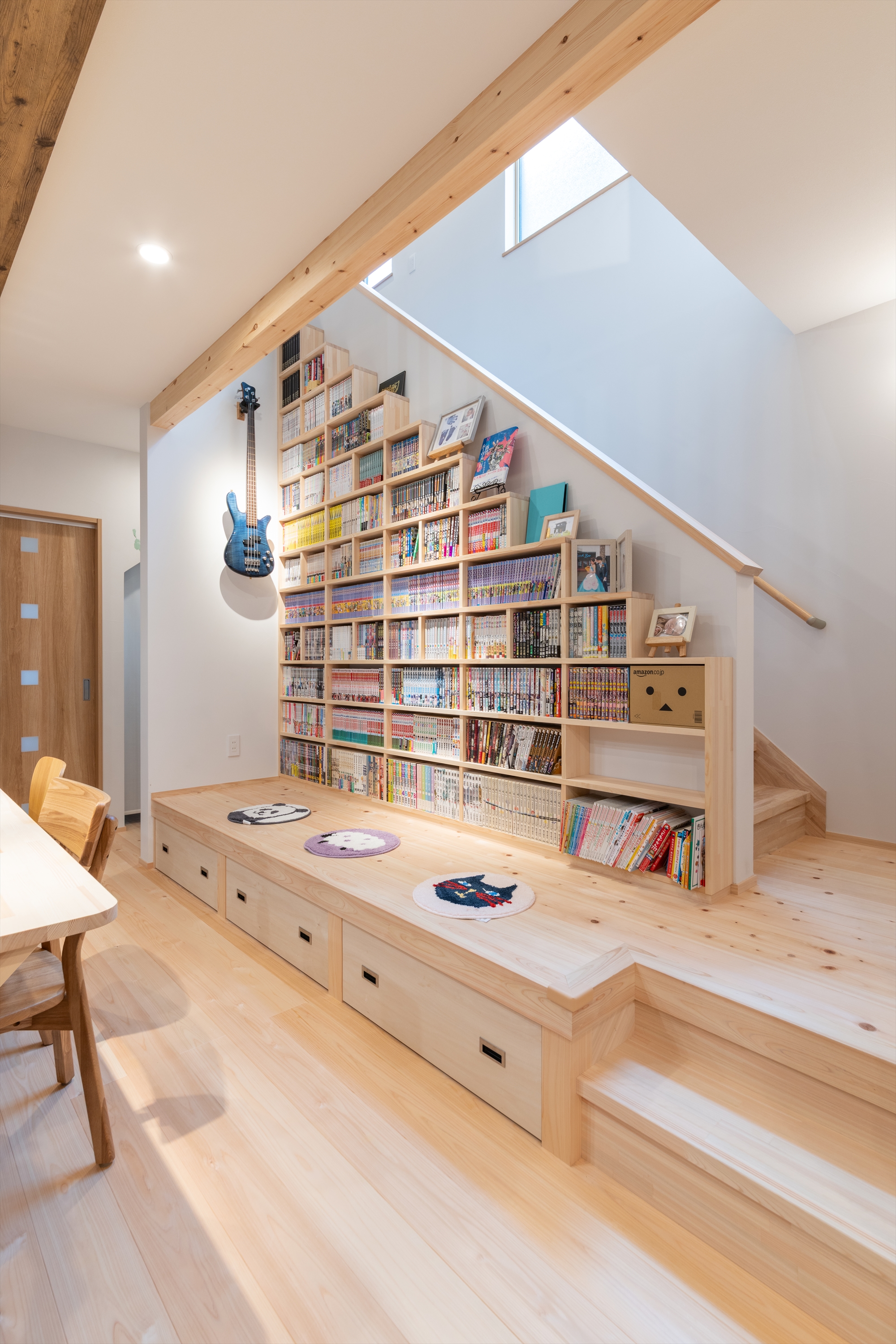 階段横のスペースを有効活用した図書コーナーは、大容量でたくさんの本を収納できます。