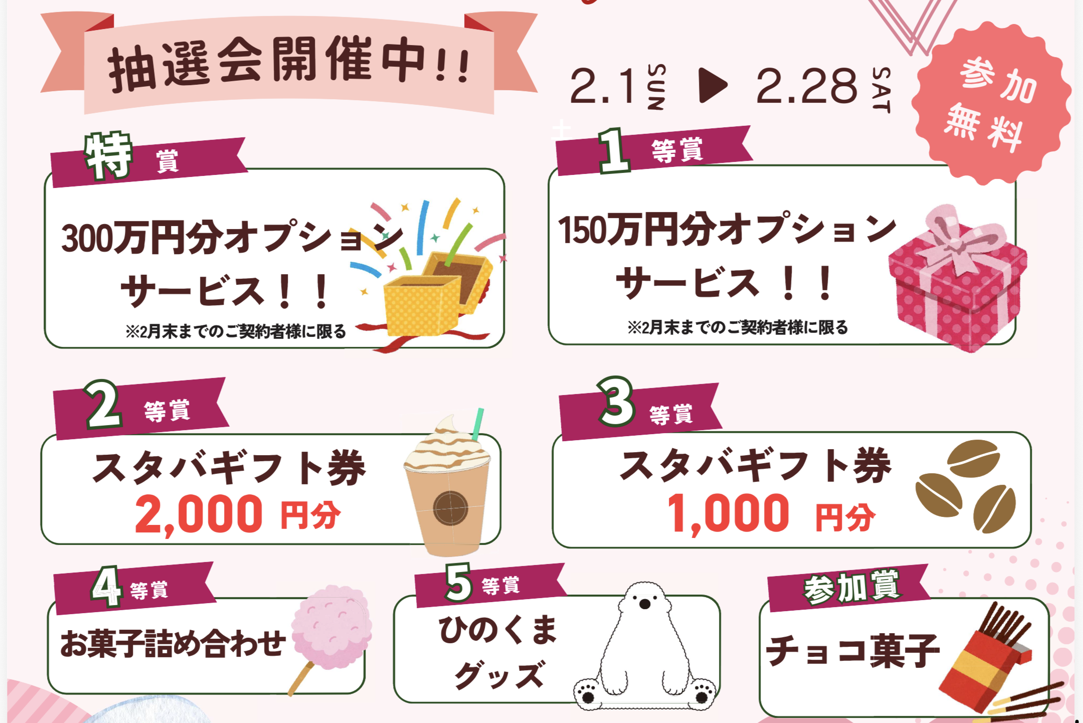 - ハズレなし! 1家族様1回限り 特等オプション300万円分プレゼント♪(数量限定 2月28日㈯までにご契約を頂いた方限定) 数に限りがございます。抽選くじ無くなりしだい終了。