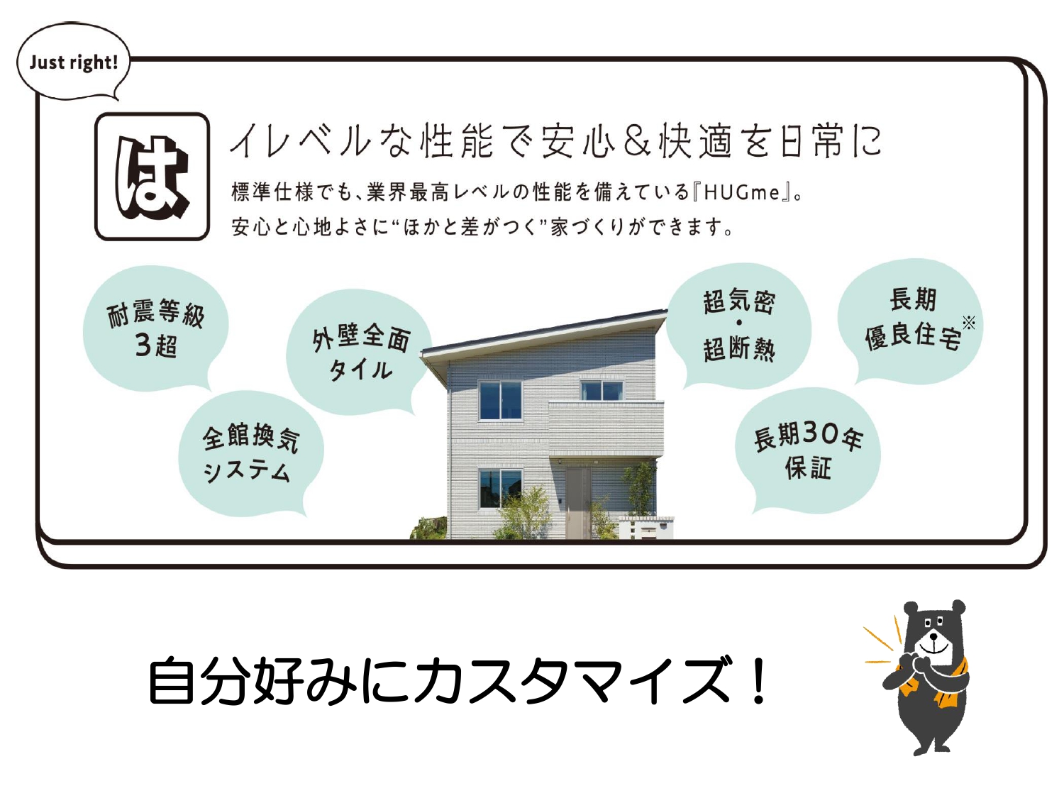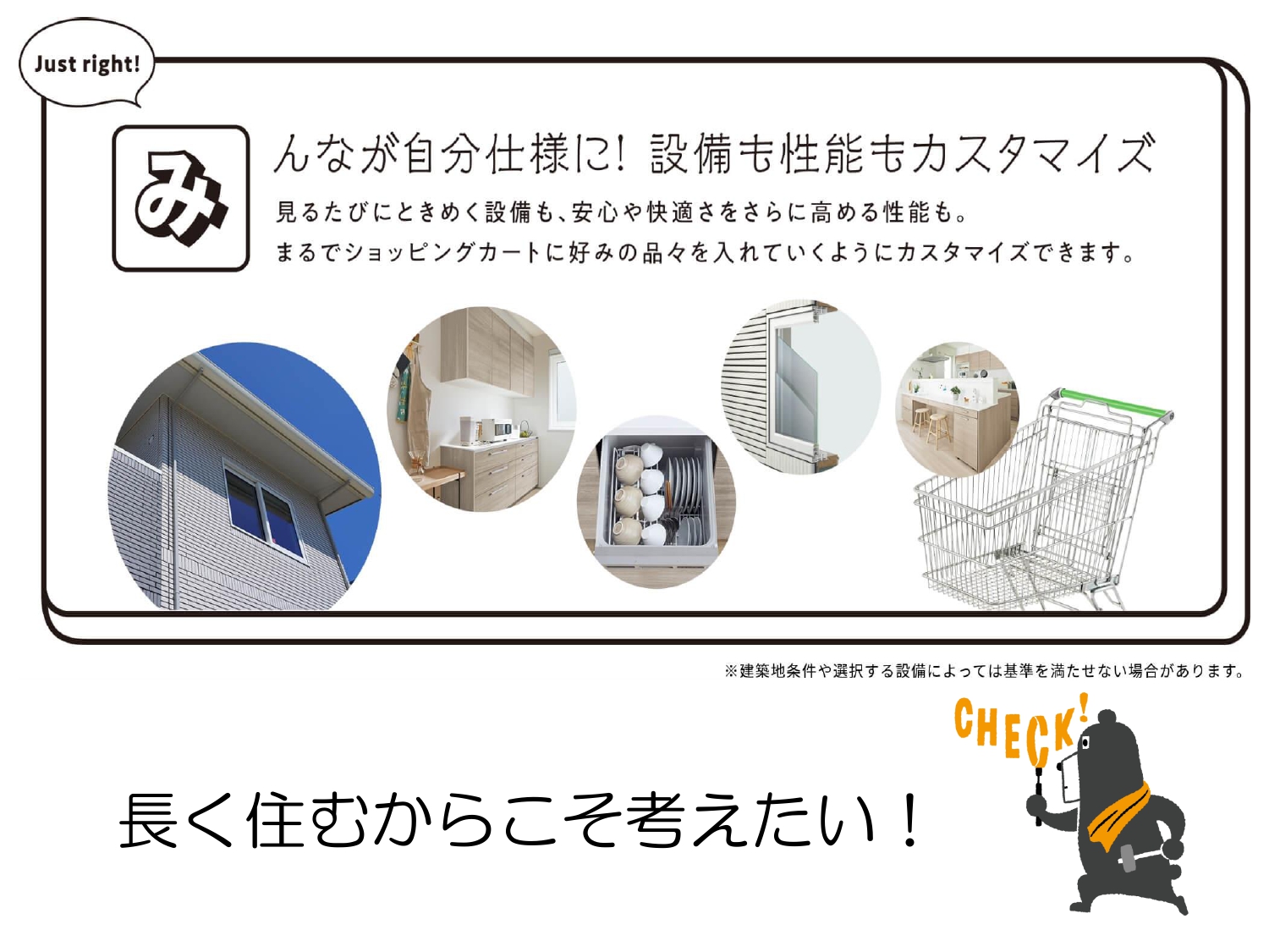 - 建てる時のちょうどよさだけではなく、家そのものが長くおトクに、そして心地よくお住まいいただくための大切な性能を備えています。自分好みにカスタマイズできる人気の商品です!