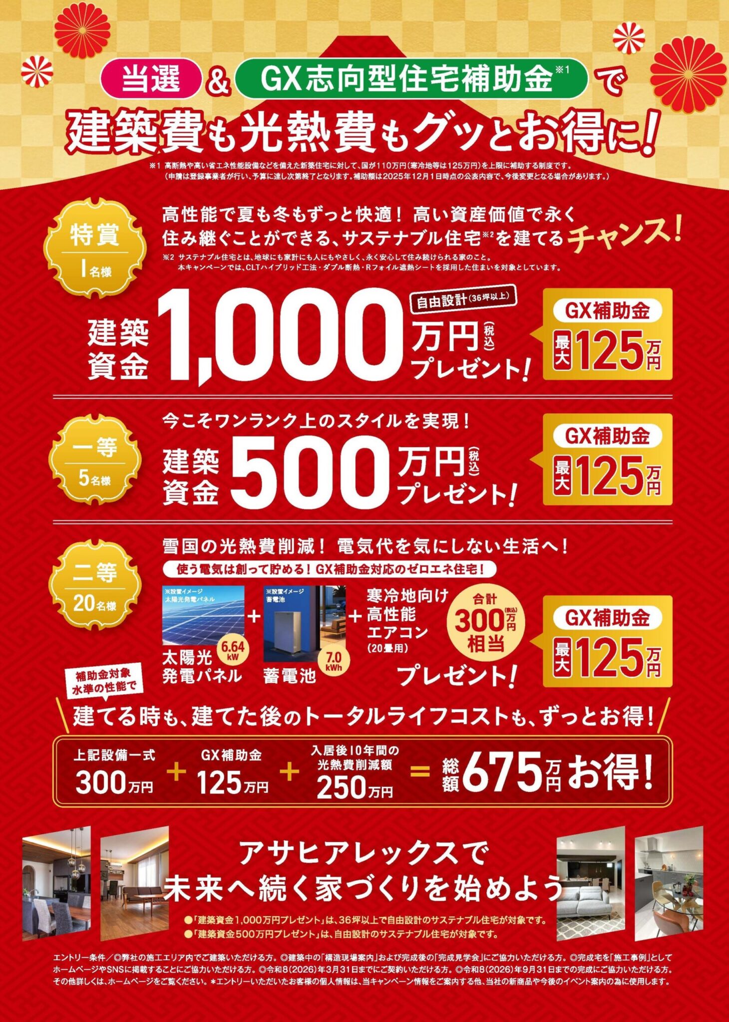 「建築資金プレゼント」に加え、GX志向型住宅補助金(上限110万円/寒冷地等は125万円)も活用できるチャンス!
