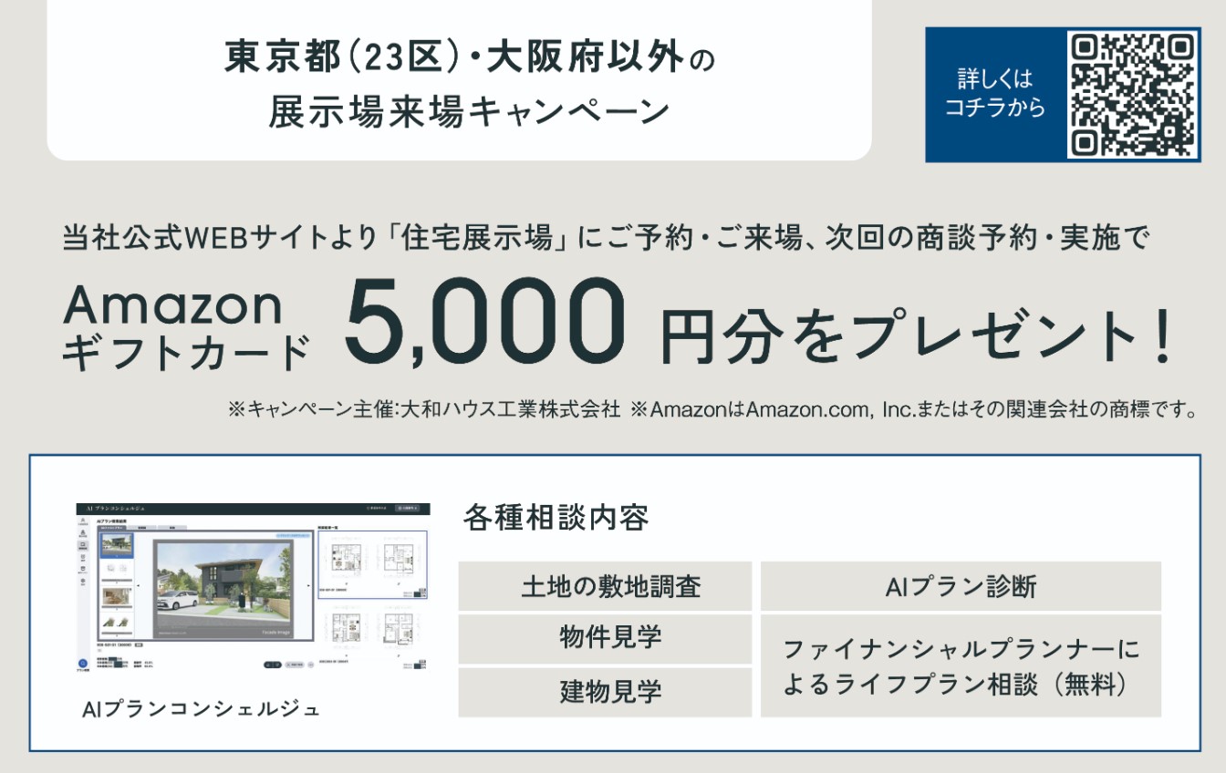 - ※2026年1月4日~3月31日の期間中、大和ハウスの公式WEBサイトから「住宅展示場」にご予約の上、ご来場いただき、各種相談(AIプラン診断、ファイナンシャルプランナーによるライフプラン相談(無料)、土地の敷地調査、物件見学、建物見学)の次回の商談を予約&実施いただいた方には「Amazonギフトカード5,000円分」をプレゼントします。
