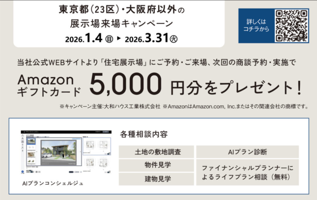 - 【展示場来場キャンペーン概要】 2026年1月4日~3月31日の期間中、大和ハウスの公式WEBサイトから「住宅展示場」にご予約の上、ご来場いただき、各種相談(AIプラン診断、ファイナンシャルプランナーによるライフプラン相談(無料)、土地の敷地調査、物件見学、建物見学)の次回の商談を予約&実施いただいた方には「Amazonギフトカード5,000円分」をプレゼントします。 展示場にて当社営業担当が専用のプレゼント応募フォームをご案内しますので、Amazonギフトカード送信用の情報を登録していただきます。 ※キャンペーン主催:大和ハウス工業株式会社 ※AmazonはAmazon.com, Inc.またはその関連会社の商標です。 【注意事項】 ●過去に大和ハウス工業の展示場・分譲地に来場されたことのない方が、大和ハウス公式WEBサイトから来場予約の上、展示場にご来場いただいた場合に限ります。 ●後日、次回の商談予約をキャンセルされた場合、「Amazon ギフトカード 5,000円分」の商品獲得の権利は無効となります。 ●専用のプレゼント応募用フォームに登録していただくAmazon ギフトカード送信用の情報は、ご予約時に登録していただいた情報(氏名、電話番号、メールアドレス)と同じ内容にしてください。 ●1家族さま 1回限り。 ●未成年者のみのご来場はご遠慮ください。 ●プレゼントは後日お渡しとなります。 ●大和ハウスより、ご登録いただいたメールアドレス宛に、2026年4月末頃にプレゼント受け取り用URLをご案内する予定ですが、状況によりご案内時期が変更となる場合がございます。 ●メールアドレスの登録間違い、受け取り側の受信設定などが理由でメールの受け取りができない場合は、賞品獲得の権利は無効となります。受信拒否や迷惑メールフォルダに振り分けされないよう、「dletter@daiwahouse.jp」からのメールを受信できるように設定をお願いします。