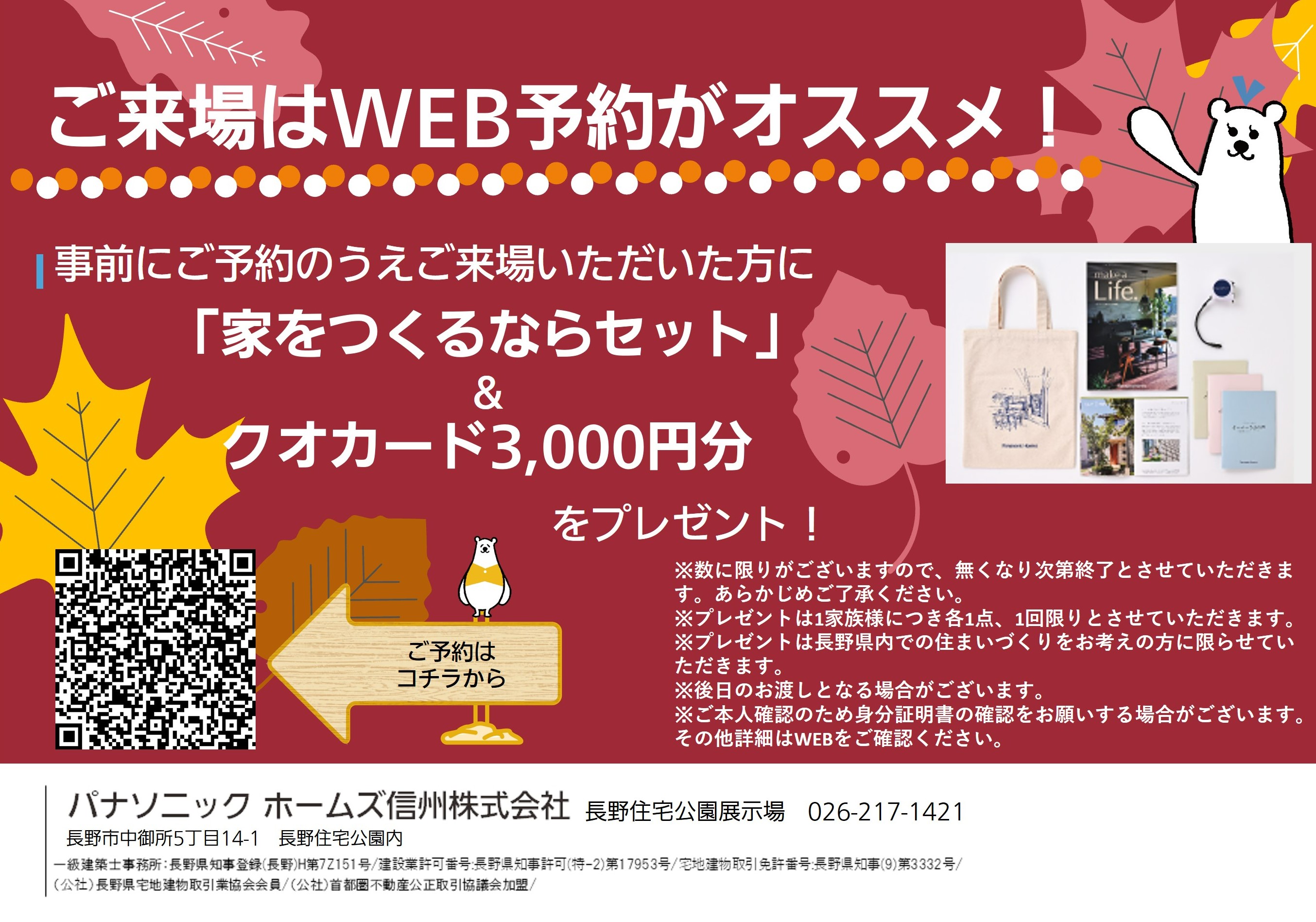 【パナソニック ホームズ信州】ご来場はWEB予約がオススメ!3,000円分クオカードプレゼント!