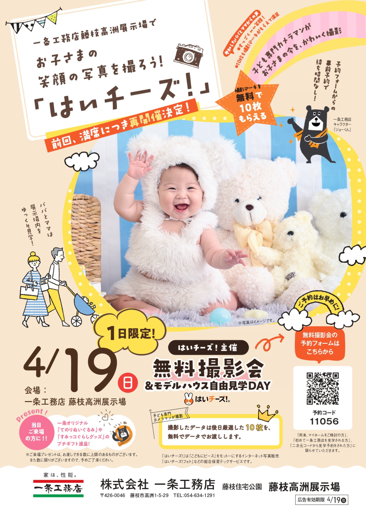 - 前回、満席につき再開催決定! 子ども専門カメラマンがお子さまの「今」を可愛く撮影。撮影データ10枚を無料でプレゼント! パパとママは展示場内をゆっくりご見学いただけます。