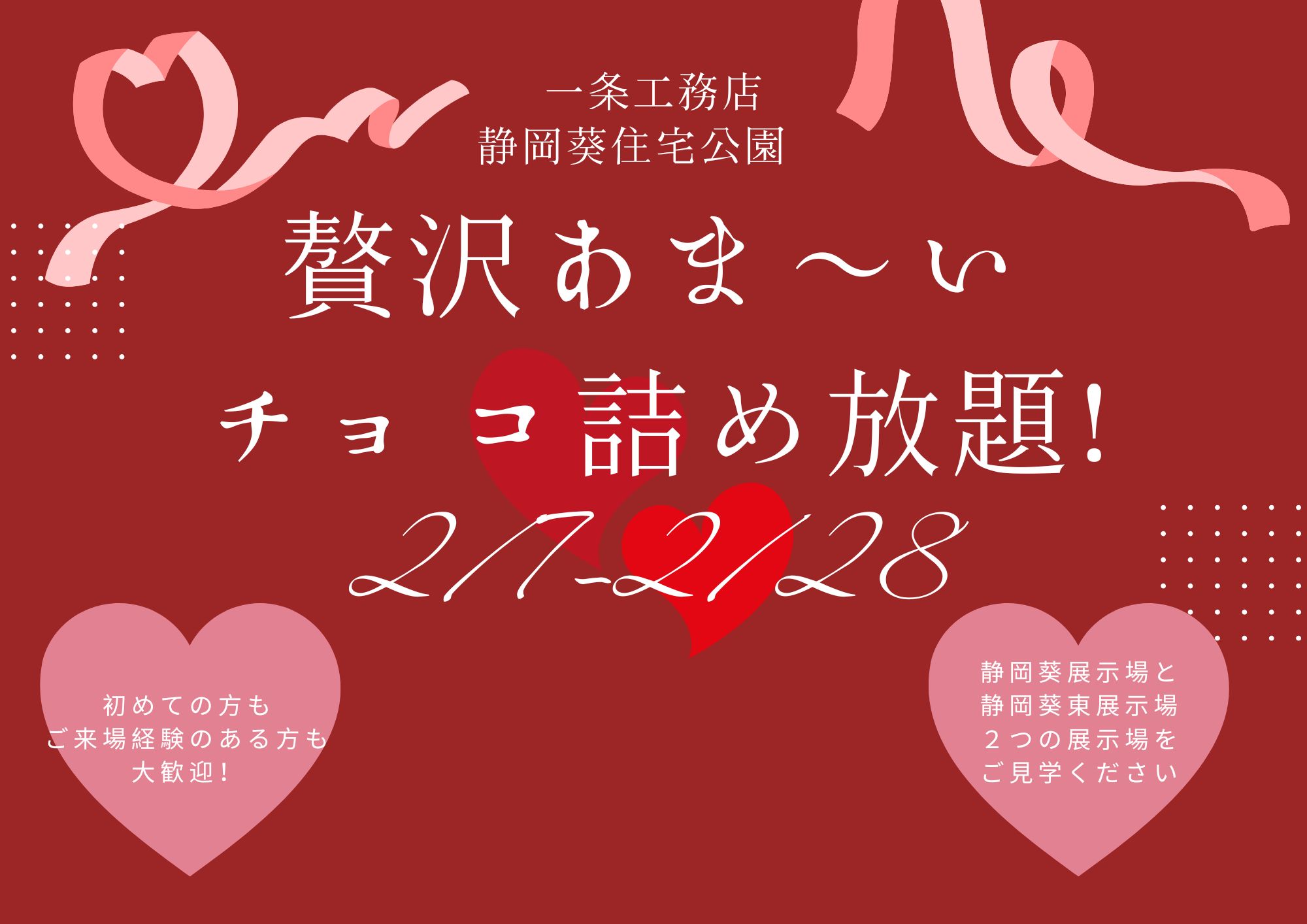 - 静岡葵展示場・静岡葵東展示場(同一敷地内)の2棟ご見学でチョコ詰め放題と豪華賞品が当たる抽選会にご参加いただけます! ぜひお気軽にご来場ください♪ ※一家族様一回限りとさせていただきます