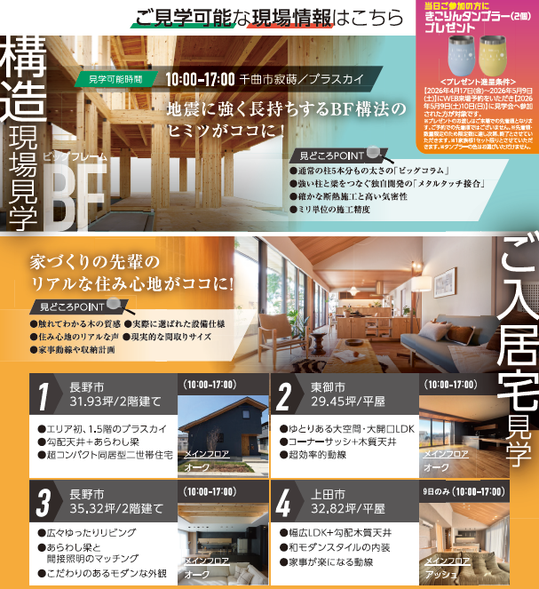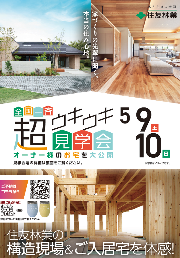 イベント詳細 長野 住宅公園イベント一覧【住友林業】超!ウキ... 長野 住友林業 【住友林業】超!ウキウキ見学会 5/9(土)・10(日)開催! イベント概要 日付: 2026年5月9日(土)・10日(日) 時間: AM10時~ PM17時 場所: 長野県内 見学会場 備考: 長野県内各地でご見学頂けます! 詳しい内容はお問合せ下さい! Web予約 電話予約 電話予約 026-217-3032 見どころポイント構造現場見学・ご入居宅見学!!Web予約電話予約電話予約026-217-3032 来場メリット アクセス 場所: 長野県内 見学会場 Google Mapで見る イベント予約について ◇当日のご案内 ・イベントのご案内を担当者から差し上げます。 ・キャンセルされる場合は、展示場のインフォメーションセンターまでご連絡ください。 必須イベント名 【住友林業】超!ウキウキ見学会 5/9(土)・10(日)開催! (長野/長野住宅公園) 必須日にち ※土日の見学をご希望の場合は前日の15時まで、平日の見学をご希望の場合は2日前までにご予約ください。15時以降にご予約いただいた場合は、ご対応できない場合がございます。 必須時間 ※イベントは各一時間ほどを予定しています。ご了承ください。 9:00~ 10:00~ 11:00~ 12:00~ 13:00~ 14:00~ 15:00~ 16:00~ 17:00~ 18:00~ 19:00~ <!-- ※3棟同時見学会、合同見学会の所要時間は2時間となっております。 (例)13:00-14:00をご選択の場合、開始13時、終了15時となります。 --> 必須参加人数 必須名前(漢字) 必須名前(かな) 必須メールアドレス 必須電話番号(携帯も可) 必須住所:郵便番号 任意住所:都道府県 長野県 北海道 青森県 岩手県 宮城県 秋田県 山形県 福島県 茨城県 栃木県 群馬県 埼玉県 千葉県 東京都 神奈川県 新潟県 富山県 石川県 福井県 山梨県 岐阜県 静岡県 愛知県 三重県 滋賀県 京都府 大阪府 兵庫県 奈良県 和歌山県 鳥取県 島根県 岡山県 広島県 山口県 徳島県 香川県 愛媛県 高知県 福岡県 佐賀県 長崎県 熊本県 大分県 宮崎県 鹿児島県 沖縄県 任意住所:市区町村 任意住所:番地 任意コメント欄 ※土日の見学をご希望の場合は前日の15時まで、平日の見学をご希望の場合は2日前までにご予約ください。15時以降にご予約いただいた場合は、ご対応できない場合がございます。