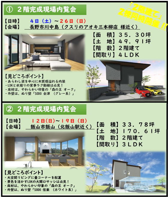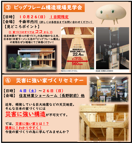 イベント詳細 長野 住宅公園イベント一覧【住友林業】10月イ... 長野 住友林業 【住友林業】10月イベント情報 イベント概要 日付: 2025年10月 時間: AM10時~ PM17時 場所: 見学会会場 備考: ※写真はイメージです。 見学会会場の場所、内容などお気軽にお問合せ下さい。 上記イベントの他に、東信エリア、松本エリアのイベントも開催中です! Web予約 電話予約 電話予約 026-217-3032 アクセス 場所: 見学会会場 Google Mapで見る イベント予約について ◇当日のご案内 ・イベントのご案内を担当者から差し上げます。 ・キャンセルされる場合は、展示場のインフォメーションセンターまでご連絡ください。 必須イベント名 【住友林業】10月イベント情報 (長野/長野住宅公園) 必須日にち ※土日の見学をご希望の場合は前日の15時まで、平日の見学をご希望の場合は2日前までにご予約ください。15時以降にご予約いただいた場合は、ご対応できない場合がございます。 必須時間 ※イベントは各一時間ほどを予定しています。ご了承ください。 9:00~ 10:00~ 11:00~ 12:00~ 13:00~ 14:00~ 15:00~ 16:00~ 17:00~ 18:00~ 19:00~ 必須参加人数 必須名前(漢字) 必須名前(かな) 必須メールアドレス 必須電話番号(携帯も可) 必須住所:郵便番号 任意住所:都道府県 長野県 北海道 青森県 岩手県 宮城県 秋田県 山形県 福島県 茨城県 栃木県 群馬県 埼玉県 千葉県 東京都 神奈川県 新潟県 富山県 石川県 福井県 山梨県 岐阜県 静岡県 愛知県 三重県 滋賀県 京都府 大阪府 兵庫県 奈良県 和歌山県 鳥取県 島根県 岡山県 広島県 山口県 徳島県 香川県 愛媛県 高知県 福岡県 佐賀県 長崎県 熊本県 大分県 宮崎県 鹿児島県 沖縄県 任意住所:市区町村 任意住所:番地 任意コメント欄 ※土日の見学をご希望の場合は前日の15時まで、平日の見学をご希望の場合は2日前までにご予約ください。15時以降にご予約いただいた場合は、ご対応できない場合がございます。