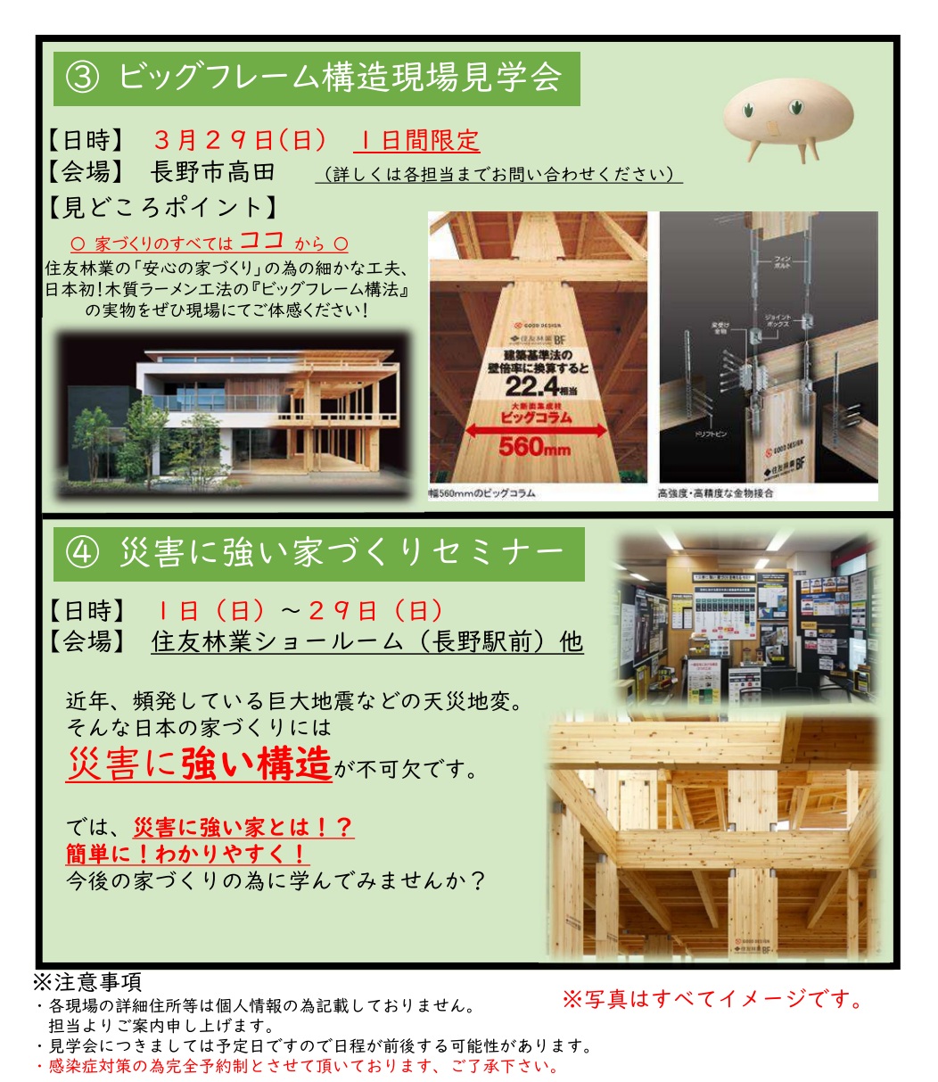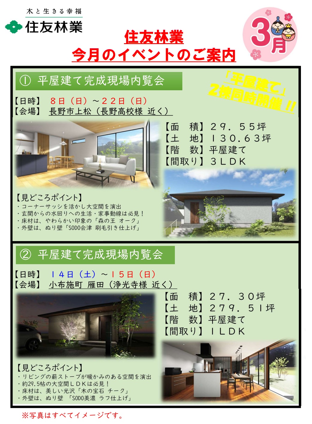 イベント詳細 長野 住宅公園イベント一覧【住友林業】3月イベ... 長野 住友林業 【住友林業】3月イベント情報 イベント概要 日付: 2026年3月 時間: AM10時~ PM17時 場所: 見学会会場 備考: ※写真はイメージです。 見学会会場の場所、内容などお気軽にお問合せ下さい。 上記イベントの他に、東信エリア、松本エリアのイベントも開催中です! Web予約 電話予約 電話予約 026-217-3032 アクセス 場所: 見学会会場 Google Mapで見る イベント予約について ◇当日のご案内 ・イベントのご案内を担当者から差し上げます。 ・キャンセルされる場合は、展示場のインフォメーションセンターまでご連絡ください。 必須イベント名 【住友林業】3月イベント情報 (長野/長野住宅公園) 必須日にち ※土日の見学をご希望の場合は前日の15時まで、平日の見学をご希望の場合は2日前までにご予約ください。15時以降にご予約いただいた場合は、ご対応できない場合がございます。 必須時間 ※イベントは各一時間ほどを予定しています。ご了承ください。 9:00~ 10:00~ 11:00~ 12:00~ 13:00~ 14:00~ 15:00~ 16:00~ 17:00~ 18:00~ 19:00~ <!-- ※3棟同時見学会、合同見学会の所要時間は2時間となっております。 (例)13:00-14:00をご選択の場合、開始13時、終了15時となります。 --> 必須参加人数 必須名前(漢字) 必須名前(かな) 必須メールアドレス 必須電話番号(携帯も可) 必須住所:郵便番号 任意住所:都道府県 長野県 北海道 青森県 岩手県 宮城県 秋田県 山形県 福島県 茨城県 栃木県 群馬県 埼玉県 千葉県 東京都 神奈川県 新潟県 富山県 石川県 福井県 山梨県 岐阜県 静岡県 愛知県 三重県 滋賀県 京都府 大阪府 兵庫県 奈良県 和歌山県 鳥取県 島根県 岡山県 広島県 山口県 徳島県 香川県 愛媛県 高知県 福岡県 佐賀県 長崎県 熊本県 大分県 宮崎県 鹿児島県 沖縄県 任意住所:市区町村 任意住所:番地 任意コメント欄 ※土日の見学をご希望の場合は前日の15時まで、平日の見学をご希望の場合は2日前までにご予約ください。15時以降にご予約いただいた場合は、ご対応できない場合がございます。