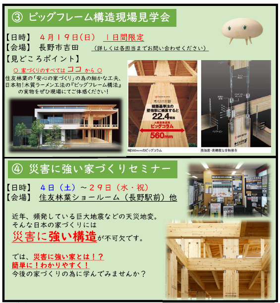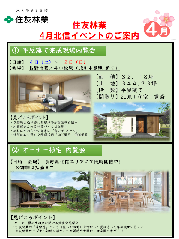 イベント詳細 長野 住宅公園イベント一覧【住友林業】4月イベ... 長野 住友林業 【住友林業】4月イベント情報 イベント概要 日付: 2026年4月 時間: AM10時~ PM17時 場所: 見学会会場 備考: ※写真はイメージです。 見学会会場の場所、内容などお気軽にお問合せ下さい。 上記イベントの他に、東信エリア、松本エリアのイベントも開催中です! Web予約 電話予約 電話予約 026-217-3032 アクセス 場所: 見学会会場 Google Mapで見る イベント予約について ◇当日のご案内 ・イベントのご案内を担当者から差し上げます。 ・キャンセルされる場合は、展示場のインフォメーションセンターまでご連絡ください。 必須イベント名 【住友林業】4月イベント情報 (長野/長野住宅公園) 必須日にち ※土日の見学をご希望の場合は前日の15時まで、平日の見学をご希望の場合は2日前までにご予約ください。15時以降にご予約いただいた場合は、ご対応できない場合がございます。 必須時間 ※イベントは各一時間ほどを予定しています。ご了承ください。 9:00~ 10:00~ 11:00~ 12:00~ 13:00~ 14:00~ 15:00~ 16:00~ 17:00~ 18:00~ 19:00~ <!-- ※3棟同時見学会、合同見学会の所要時間は2時間となっております。 (例)13:00-14:00をご選択の場合、開始13時、終了15時となります。 --> 必須参加人数 必須名前(漢字) 必須名前(かな) 必須メールアドレス 必須電話番号(携帯も可) 必須住所:郵便番号 任意住所:都道府県 長野県 北海道 青森県 岩手県 宮城県 秋田県 山形県 福島県 茨城県 栃木県 群馬県 埼玉県 千葉県 東京都 神奈川県 新潟県 富山県 石川県 福井県 山梨県 岐阜県 静岡県 愛知県 三重県 滋賀県 京都府 大阪府 兵庫県 奈良県 和歌山県 鳥取県 島根県 岡山県 広島県 山口県 徳島県 香川県 愛媛県 高知県 福岡県 佐賀県 長崎県 熊本県 大分県 宮崎県 鹿児島県 沖縄県 任意住所:市区町村 任意住所:番地 任意コメント欄 ※土日の見学をご希望の場合は前日の15時まで、平日の見学をご希望の場合は2日前までにご予約ください。15時以降にご予約いただいた場合は、ご対応できない場合がございます。