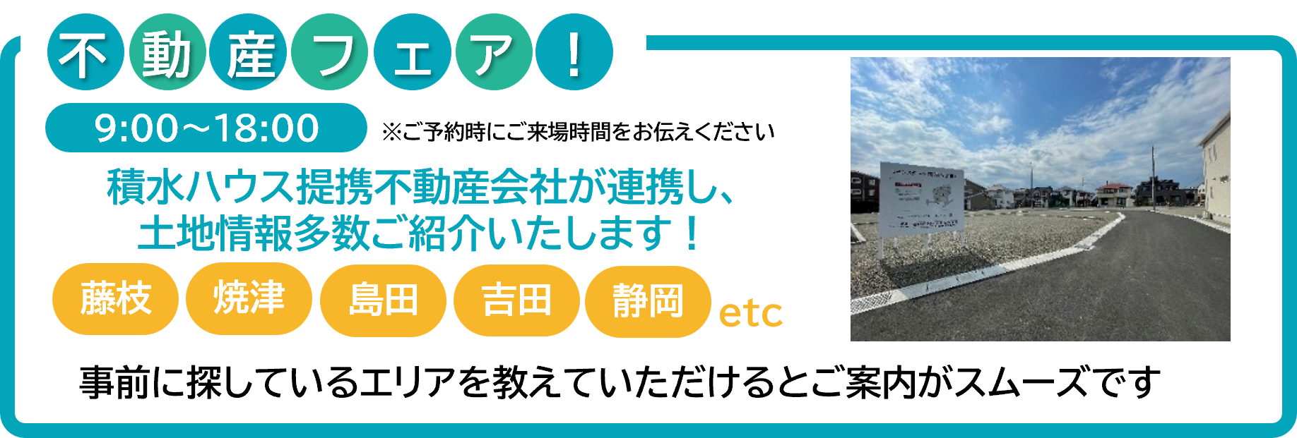 イベント詳細 藤枝 住宅公園イベント一覧【参加費無料】不動産... 藤枝 積水ハウス 【参加費無料】不動産フェア&住宅資金相談会 イベント概要 日付: 2026年2月14日(土)・15日(日) 2日間限定 時間: 9時~18時 場所: 藤枝住宅公園 積水ハウス株式会社 イズ藤枝展示場 備考: ご予約の上、ご来場いただくと素敵なプレゼントご用意しております Web予約 電話予約 電話予約 054-625-8207 見どころポイントWeb予約電話予約電話予約054-625-8207 来場メリット不動産フェア積水ハウス提携不動産会社が連携し、土地情報多数ご紹介いたします!事前に探しているエリアを教えていただけるとご案内がスムーズです。住宅資金相談会ファイナンシャルプランナーによる個別相談! 豊富な知識と経験で、お答えします。 住宅ローン・保険・教育資金・・あなたにぴったりのライフプランを個別にご提案します。 アクセス 場所: 藤枝住宅公園 積水ハウス株式会社 イズ藤枝展示場 Google Mapで見る イベント予約について ◇当日のご案内 ・イベントのご案内を担当者から差し上げます。 必須イベント名 【参加費無料】不動産フェア&住宅資金相談会 (静岡エリア/藤枝住宅公園) 必須ご来場日時を選択 2026-02-14 2026-02-15 9:00~ 10:00~ 11:00~ 12:00~ 13:00~ 14:00~ 15:00~ 16:00~ 17:00~ 18:00~ 必須参加人数 必須名前(漢字) 必須名前(かな) 必須メールアドレス 必須電話番号(携帯も可) 必須住所:郵便番号 任意住所:都道府県 静岡県 北海道 青森県 岩手県 宮城県 秋田県 山形県 福島県 茨城県 栃木県 群馬県 埼玉県 千葉県 東京都 神奈川県 新潟県 富山県 石川県 福井県 山梨県 長野県 岐阜県 愛知県 三重県 滋賀県 京都府 大阪府 兵庫県 奈良県 和歌山県 鳥取県 島根県 岡山県 広島県 山口県 徳島県 香川県 愛媛県 高知県 福岡県 佐賀県 長崎県 熊本県 大分県 宮崎県 鹿児島県 沖縄県 任意住所:市区町村 任意住所:番地 任意コメント欄