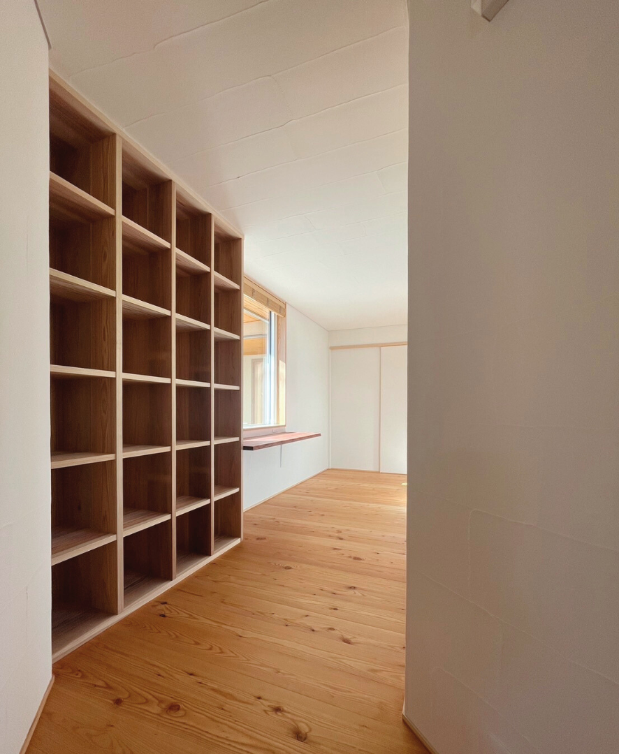 廊下の窓越しに緑を眺めながら、本を読んだりピアノを弾いたり、家族それぞれが好きな時間を過ごせる空間。