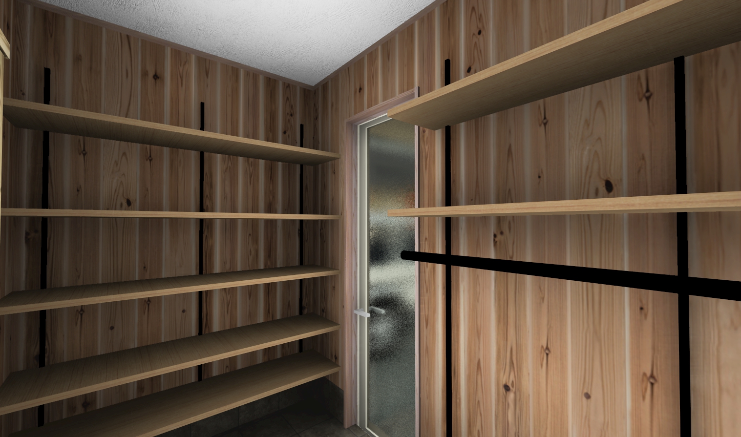 登山グッズなどをたっぷりと収納できるよう壁一面に可動棚を計画。