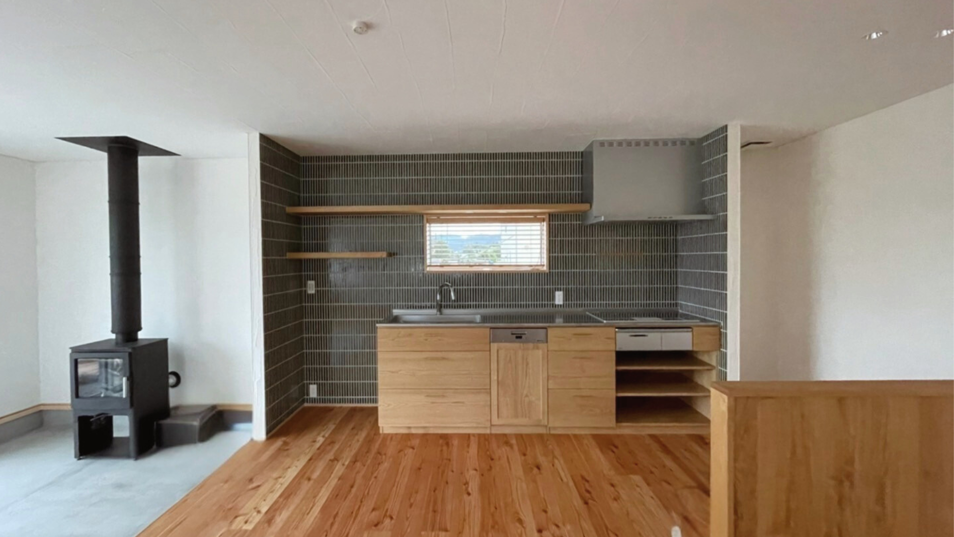 壁面は緑のタイル仕上げの造作キッチンは、伊那の家具工房「木のすず」さん、