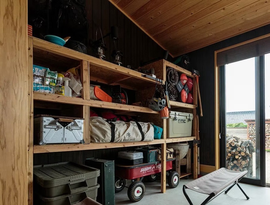 登山グッズなどをたっぷりと収納できるよう壁一面に可動棚を計画。