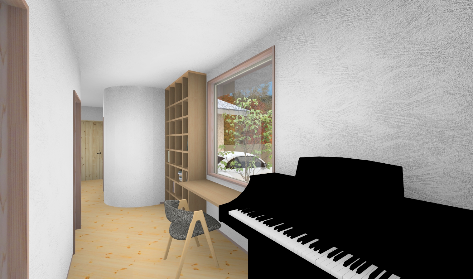 廊下の窓越しに緑を眺めながら、本を読んだりピアノを弾いたり、家族それぞれが好きな時間を過ごせる空間。