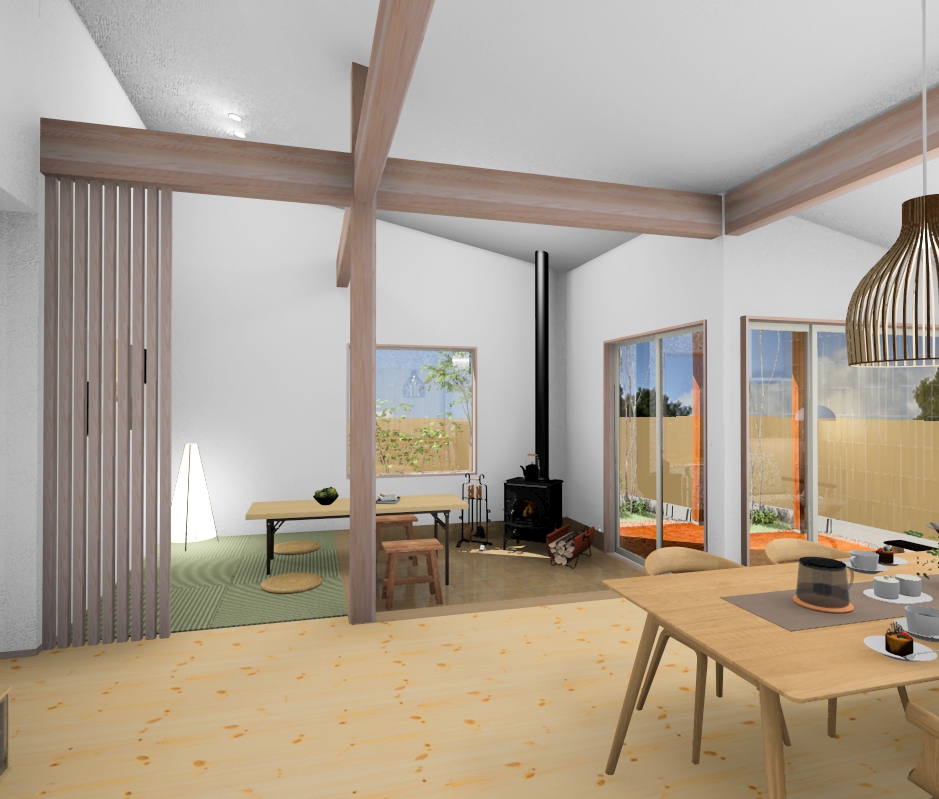 南の庭へつながる、四畳半の土間サロンとウッドデッキを設えました。