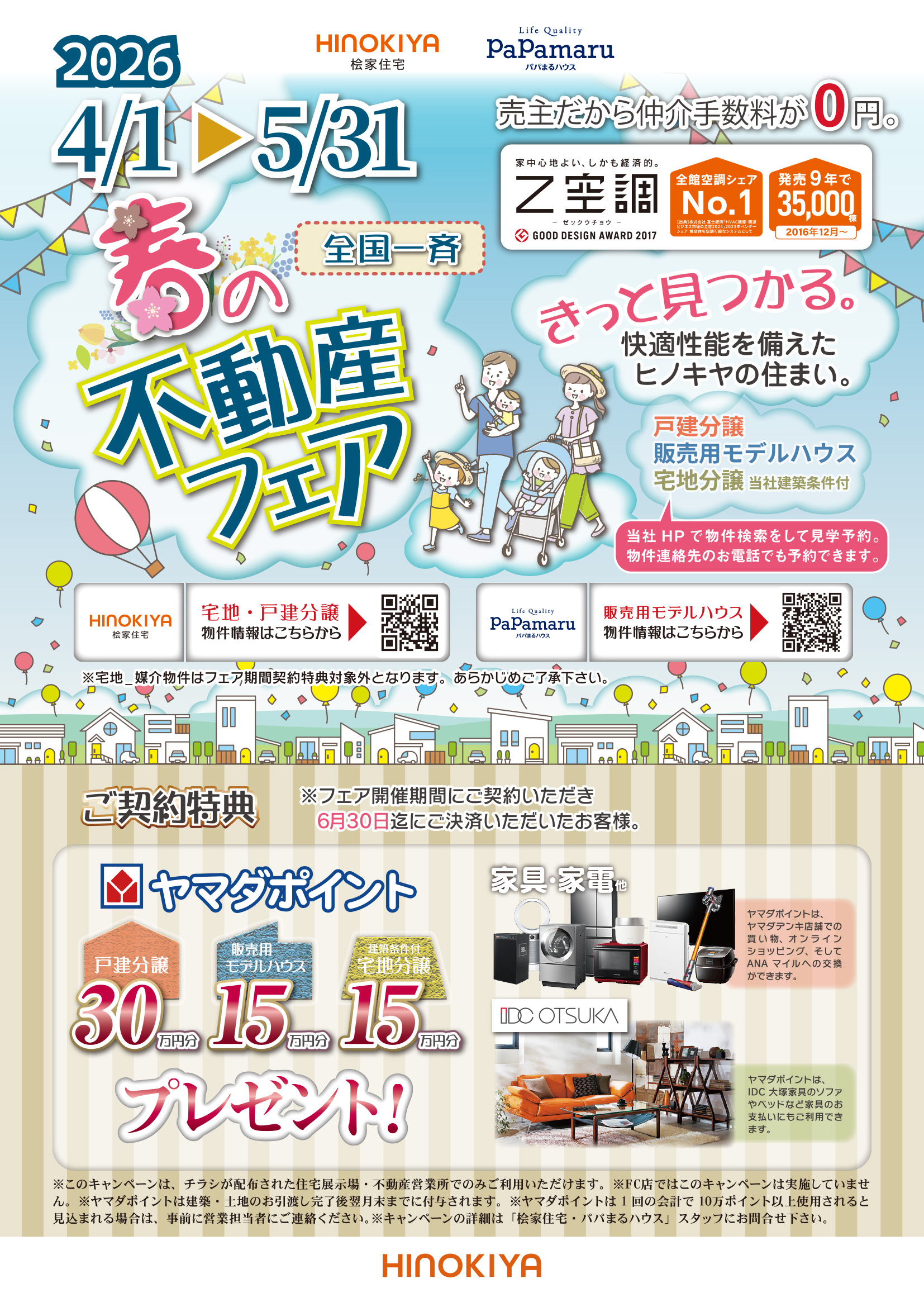 2026/4/1~2026/5/31 全国一斉春の不動産フェア開催!! 売主だから仲介手数料が0円 家中心地よい、しかも経済的なZ空調を標準搭載! 快適性能を備えたヒノキヤの住まいがきっと見つかります♪ お日にちによっては来場限定特典も取り揃えております♪ 詳しくはお問合せください。