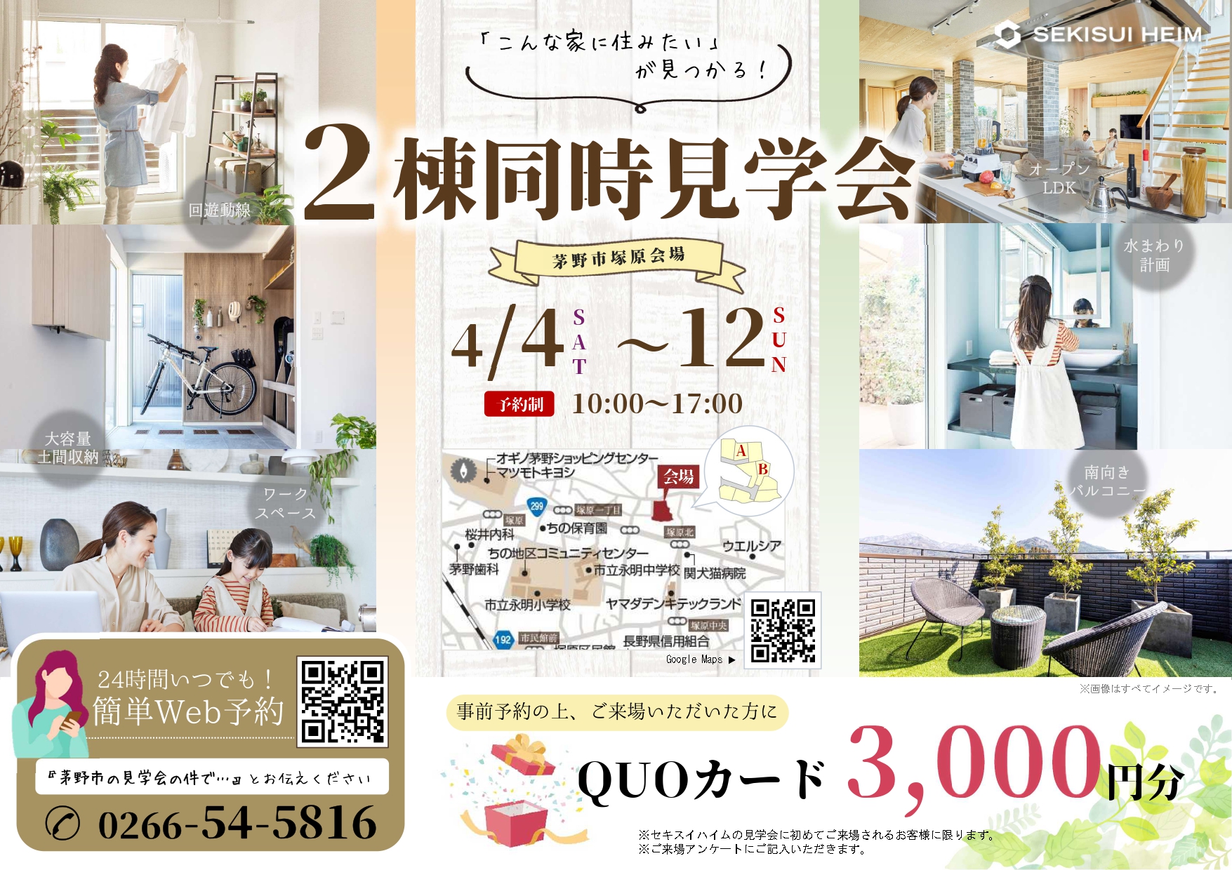イベント詳細 諏訪 住宅公園イベント一覧【茅野市塚原】2棟同... 諏訪 セキスイハイム信越 イベント住まいの体験会完成現場見学会見学会 【茅野市塚原】2棟同時見学会開催! イベント概要 日付: 4/4(土)~12(日) ※火・水曜日定休 時間: <予約制> 10:00~17:00 場所: スマートハイムプレイス茅野市塚原 Web予約 電話予約 電話予約 0266-58-6464 見どころポイントWeb予約電話予約電話予約0266-58-6464 アクセス 場所: スマートハイムプレイス茅野市塚原 Google Mapで見る イベント予約について ◇当日のご案内 ・イベントのご案内を担当者から差し上げます。 必須イベント名 【茅野市塚原】2棟同時見学会開催! (長野/諏訪住宅公園) 必須ご来場日時を選択 2026-04-04 2026-04-05 2026-04-06 2026-04-09 2026-04-10 2026-04-11 2026-04-12 10時~11時 11時~12時 12時~13時 13時~14時 14時~15時 15時~16時 16時~17時 必須参加人数 必須名前(漢字) 必須名前(かな) 必須メールアドレス 必須電話番号(携帯も可) 必須住所:郵便番号 任意住所:都道府県 長野県 北海道 青森県 岩手県 宮城県 秋田県 山形県 福島県 茨城県 栃木県 群馬県 埼玉県 千葉県 東京都 神奈川県 新潟県 富山県 石川県 福井県 山梨県 岐阜県 静岡県 愛知県 三重県 滋賀県 京都府 大阪府 兵庫県 奈良県 和歌山県 鳥取県 島根県 岡山県 広島県 山口県 徳島県 香川県 愛媛県 高知県 福岡県 佐賀県 長崎県 熊本県 大分県 宮崎県 鹿児島県 沖縄県 任意住所:市区町村 任意住所:番地 任意コメント欄