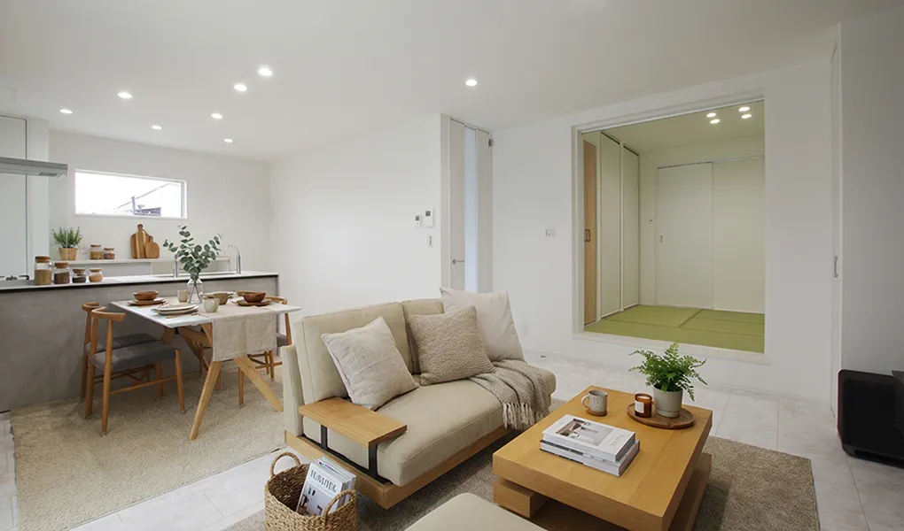 1階はホワイトの石柄床に、エコカラットや間接照明を組み合わせて清潔感・高級感あふれる空間です。リビングに隣接する和室は、扉を閉めれば独立した客間としても機能。多世代が集う場所だからこそ、明るさと高級感を大切にした設計です。