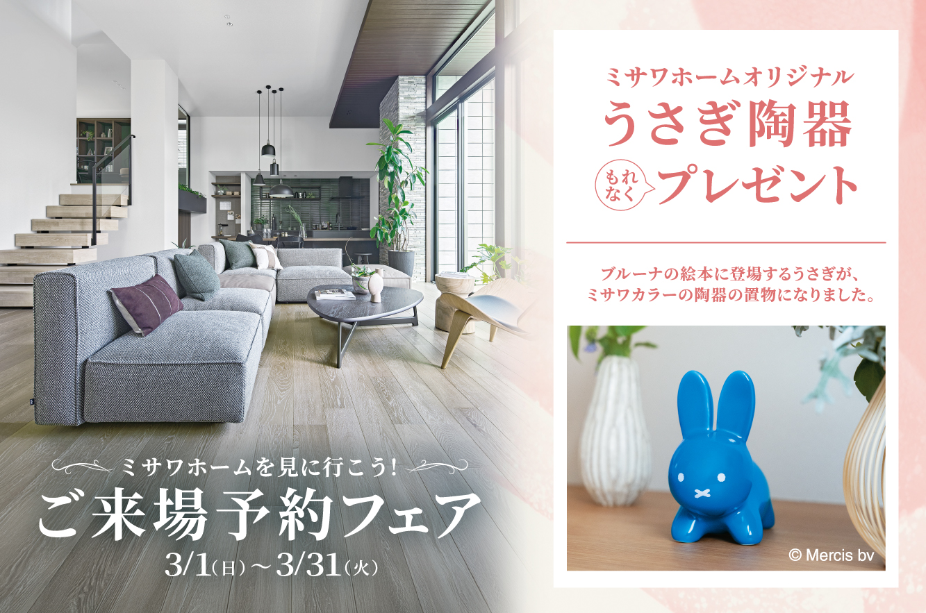 【3月限定・新潟エリア限定】 WEB来場予約の上、はじめて展示場にご来場いただいた方へミサワホームオリジナル「うさぎ陶器」と商品券3,000円をプレゼントいたします!(展示場ご来場でうさぎ陶器+次回建物見学イベントのご参加で商品券3,000円プレゼント) ※特典はミサワホームの展示場へ初めてご来場の方でマイホームのご購入やご建築をお考えの方に限ります。 ※ミサワホーム公式HP「お近くのミサワホーム」からご予約ください。 ※来場予定日にご見学いただけない場合があります。(火曜・水曜定休) ※ご予約の上ご来場いただきアンケートにご回答いただいた方を対象とさせていただきます。 ※スタッフより事前確認連絡をさせていただき、確認が取れない場合での来場は特典を差し上げられない場合がございます。 ※1家族1点限りとなります。 ※当日、身分証明書のご提示をお願いする場合がございます。 ■キャンペーン対象外の方:来場予約されてない方、当日予約の方、指定の来場予約フォーム以外から予約された方、リフォームをご相談の方、未成年者や学生の方、既に当社あるいは他社とご契約いただいてる方、その他の来場予約キャンペーンとの併用は不可。