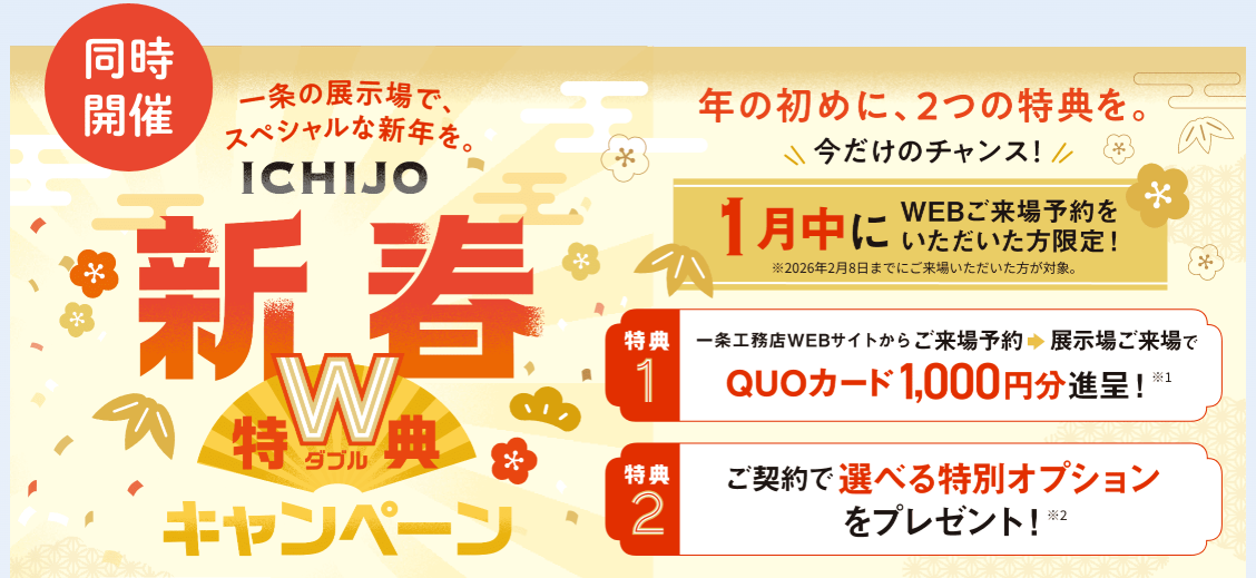 イベント詳細 藤枝 住宅公園イベント一覧一条工務店★新春キャ... 藤枝 一条工務店 一条工務店★新春キャンペーン★1月中にWEB来場予約していただいた方限定でWで特典が!! イベント概要 日付: 1月中!(一条公式HPからWEBご来場予約をいただいた方限定) 時間: 10:00~18:00 場所: 藤枝住宅公園内 一条工務店 藤枝高洲展示場 備考: 今だけのチャンス!一月中にWEBご来場予約をいただいた方限定!(2/8までにご来場いただいた方が対象) 年の初めに2つの特典をご用意しました!ご予約は必ず一条の公式ホームページからお願いいたします。 ※イベントの詳細は下記よりご確認ください! https://www.ichijo.co.jp/dm/newyear_CP2026/ ※ご予約は下記の一条工務店ホームページからご予約ください! https://www.ichijo.co.jp/guide/form/?exhId=577 アクセス 場所: 藤枝住宅公園内 一条工務店 藤枝高洲展示場 Google Mapで見る イベント予約について