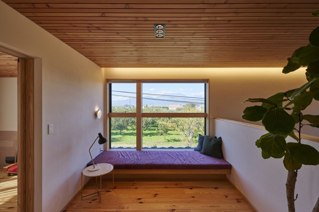 土間サロンからウッドデッキへと繋がり、北信五岳を望む。