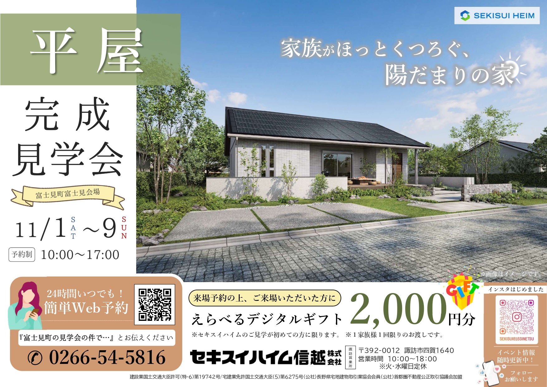 イベント詳細 諏訪 住宅公園イベント一覧富士見町【実邸見学会... 諏訪 セキスイハイム信越 イベント完成現場見学会 富士見町【実邸見学会】家族がほっとくつろぐ、陽だまりの家 イベント概要 日付: 11月1日~9日 ※火・水曜日定休 時間: 【予約制】10:00~17:00 場所: 富士見町富士見 Web予約 電話予約 電話予約 0266-58-6464 見どころポイントWeb予約電話予約電話予約0266-58-6464 アクセス 場所: 富士見町富士見 Google Mapで見る イベント予約について ◇当日のご案内 ・イベントのご案内を担当者から差し上げます。 必須イベント名 富士見町【実邸見学会】家族がほっとくつろぐ、陽だまりの家 (長野/諏訪住宅公園) 必須ご来場日時を選択 2025-11-06 2025-11-07 2025-11-08 2025-11-09 10時~11時 11時~12時 12時~13時 13時~14時 14時~15時 15時~16時 16時~17時 必須参加人数 必須名前(漢字) 必須名前(かな) 必須メールアドレス 必須電話番号(携帯も可) 必須住所:郵便番号 任意住所:都道府県 長野県 北海道 青森県 岩手県 宮城県 秋田県 山形県 福島県 茨城県 栃木県 群馬県 埼玉県 千葉県 東京都 神奈川県 新潟県 富山県 石川県 福井県 山梨県 岐阜県 静岡県 愛知県 三重県 滋賀県 京都府 大阪府 兵庫県 奈良県 和歌山県 鳥取県 島根県 岡山県 広島県 山口県 徳島県 香川県 愛媛県 高知県 福岡県 佐賀県 長崎県 熊本県 大分県 宮崎県 鹿児島県 沖縄県 任意住所:市区町村 任意住所:番地 任意コメント欄