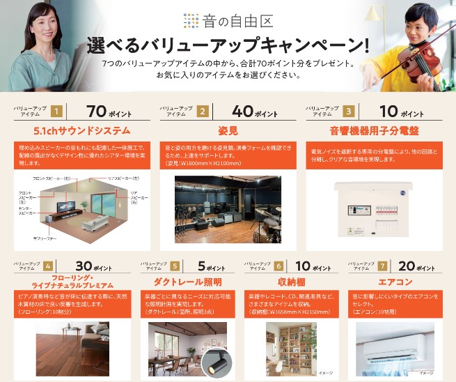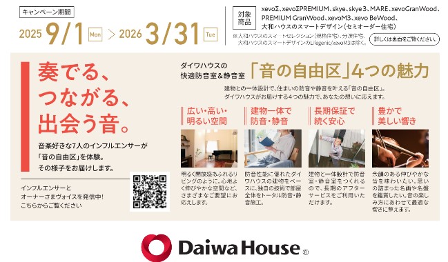 - 【申込条件】次の条件をすべて満たす方 〇全国の支社・支店の営業エリア内に建築可能な土地(自己所有・借地)をお持ちの方もしくは購入予定の方で2025年9月1日から2026年3月31日までに音の自由区を採用した戸建て住宅の建築請負契約を新規に締結していただける方。(敷地条件等によっては建築できない場合がございます)2026年12月25日までにお引渡し可能な方。ただし、skye、skye3、xevoGranWood(3階建)、MAREは2027年3月31日までお引渡し可能な方。 〇対象商品:xevoΣ、xevoΣPUREMIUM、skye、skye3、MARE、xevoGranWood、PUREMIUM GranWood、xevoM3、xevo BeWood、大和ハウスのスマートデザイン(セミオーダー住宅) ※大和ハウスのスマートセレクション(規格住宅)、分譲住宅、大和ハウスのスマートデザインのLifegenic/xevoM3は除く。ただし建設場所や条件によって設置できない場合があります。※5.1chサウンドシステムは奏でる家+で採用は不可、大和ハウスのスマートデザイン(セミオーダー住宅)の防音室2階設置は不可。 【注意事項】〇他のキャンペーン・割引制度との併用など、詳しくは担当者にお尋ねください。〇契約後にサービス工事のキャンセルがあったとしても、ポイントは復活せず、代金清算も行いません。