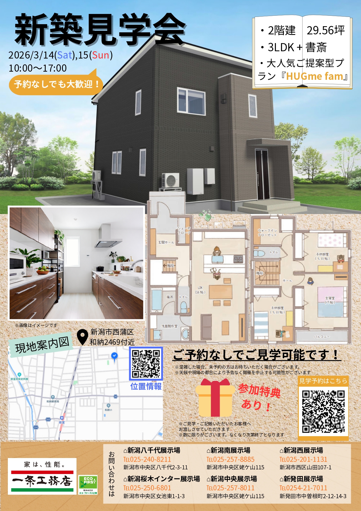 3月14日(土)~15日(日)『新築見学会in西蒲区和納』大人気HUGme fam新築見学会開催♪◇床暖房だけで暖かい住まいをぜひご体感ください◇
