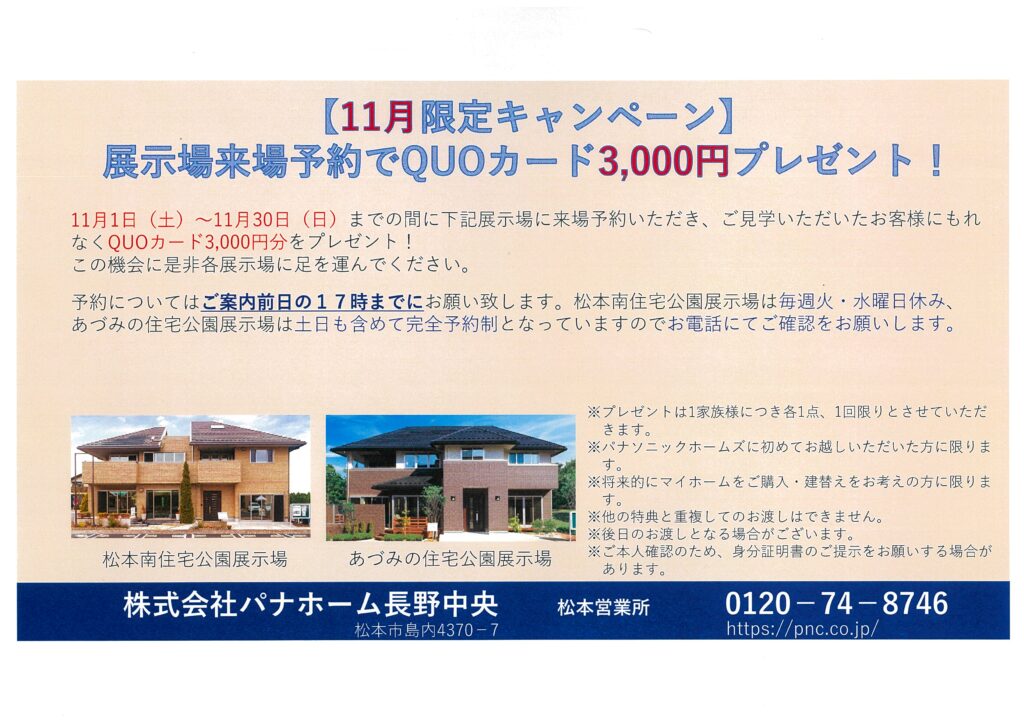 【パナホーム長野中央】◆展示場来場予約でQUOカード3,000円分プレゼント!