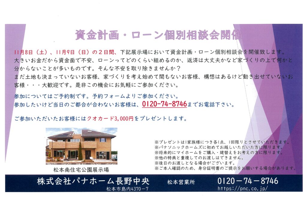 【パナホーム長野中央】資金計画・ローン個別相談会開催