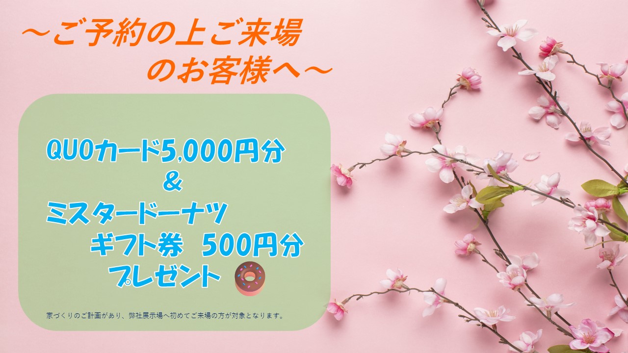 - 特典は葵住宅公園展示場内のPanasonic Homes展示場へご来場していただき、且つ弊社への初めてのご見学のお客様が対象となります。 2026年3月29日(日)までに、下記予約フォームでのお申込みをしていただき、展示場にご来場された方に限ります。御予約特典の準備等の関係で、ご予約日2日前までにWEBフォームでご予約下さい。その他ご不明点につきましては、展示場へご連絡お待ちしております。