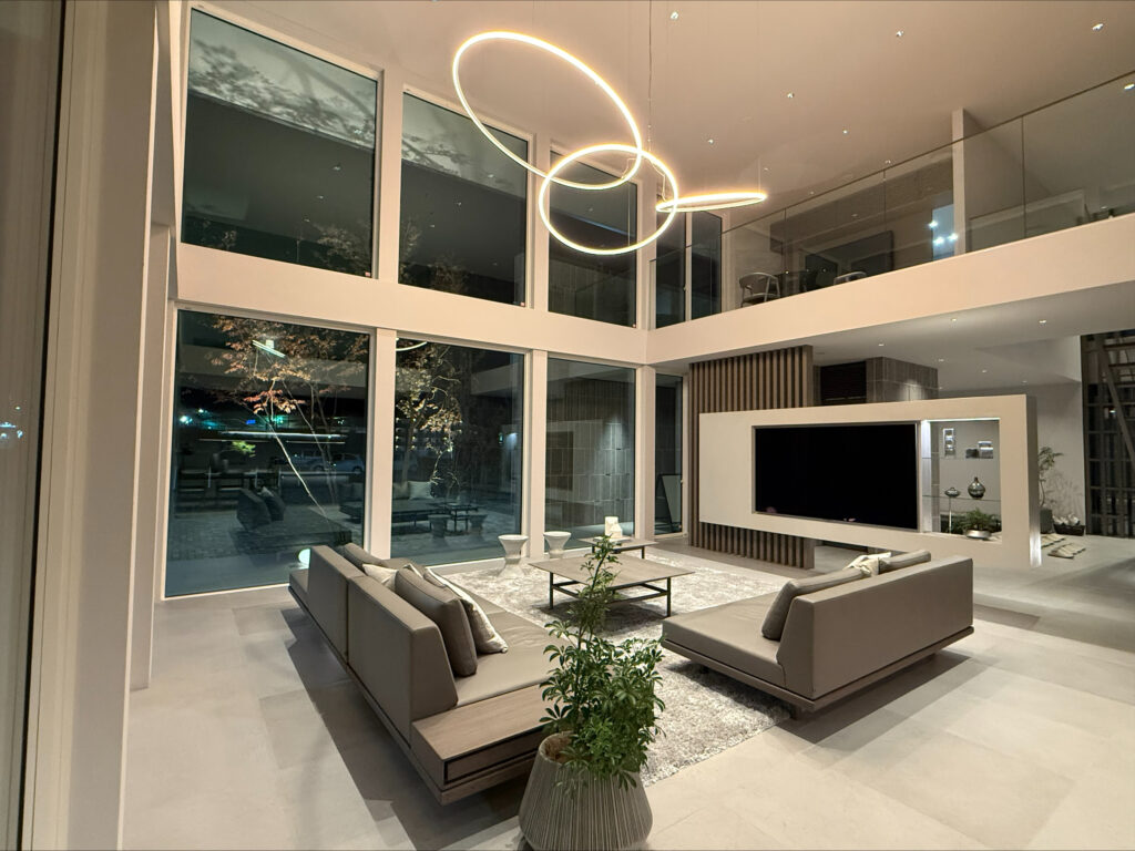 吹抜け6m×6mの大空間と階段吹抜けによる開放感を演出し、静謐さとやわらかさを感じられる展示場です。