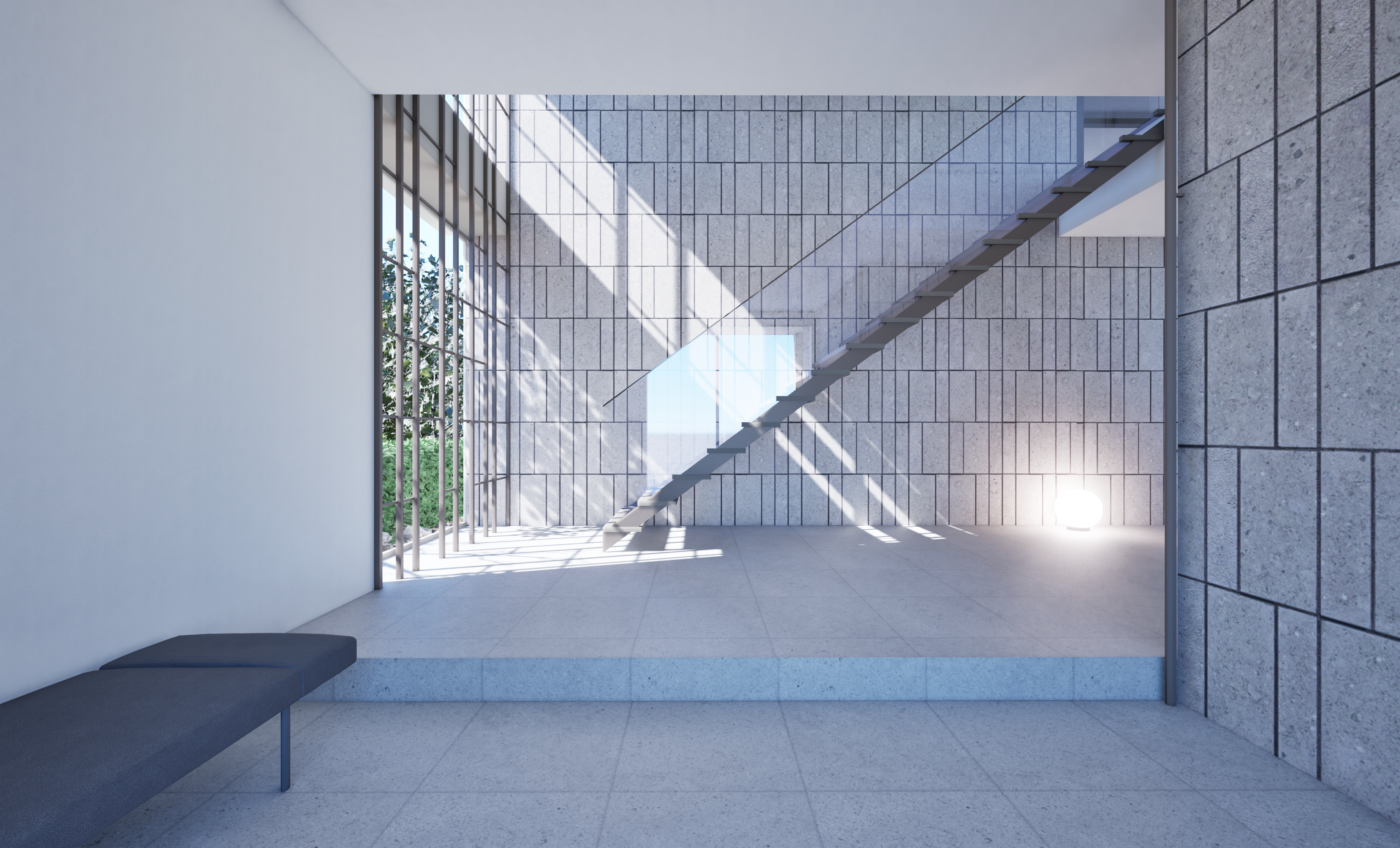 吹抜け6m×6mの大空間と階段吹抜けによる開放感を演出し、静謐さとやわらかさを感じられる展示場です。