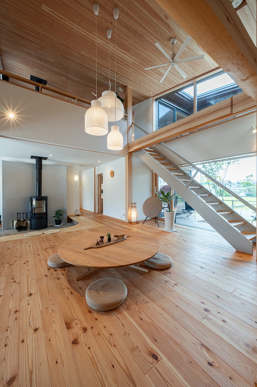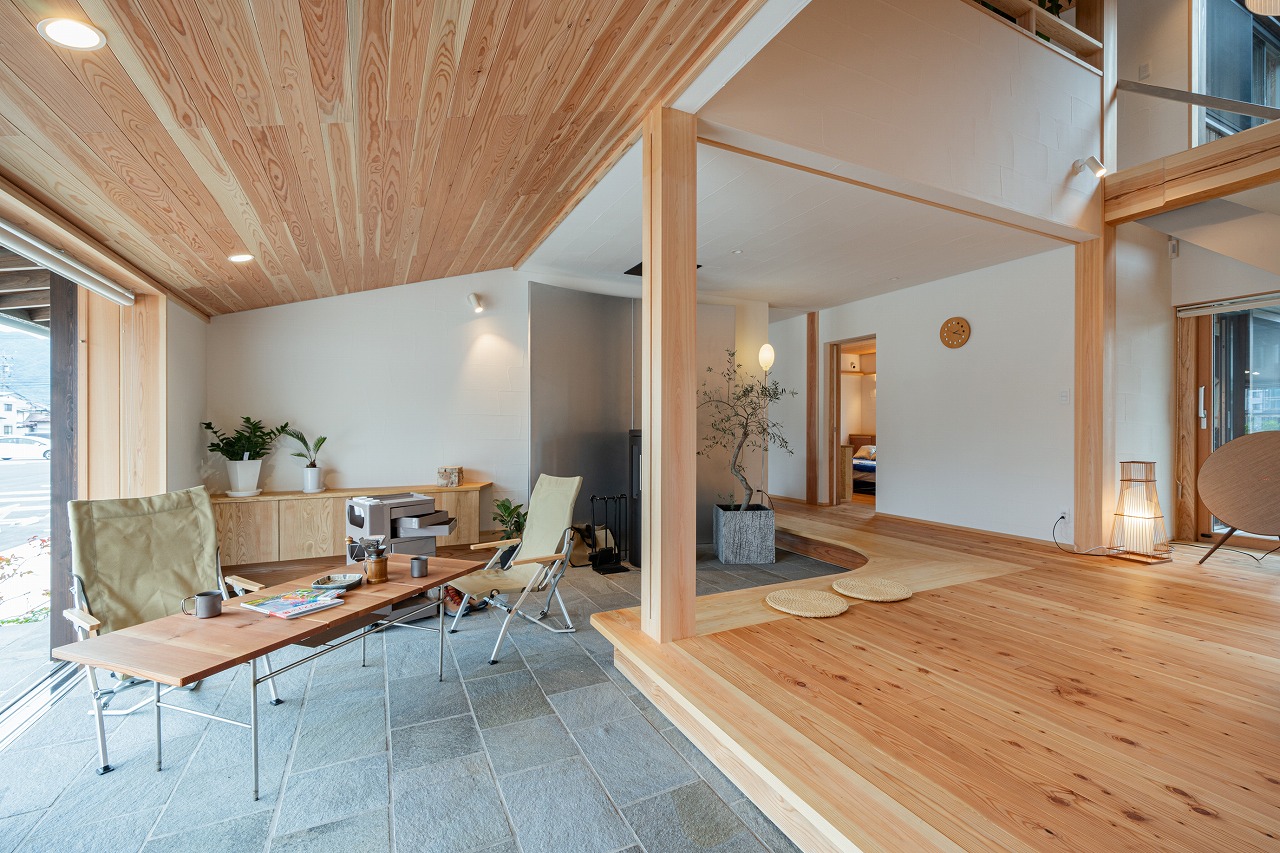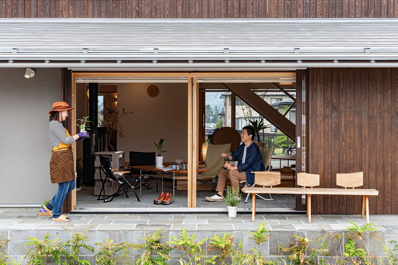 土間サロンの開口の先には外土間が続き、外と内の境界がありません。 内で過ごす家族も、外を楽しむ家族も、互いに好きなことをしながら一体感があります。
