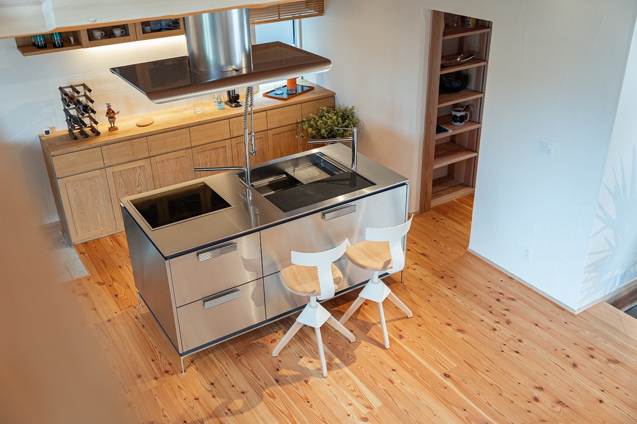 キューブ型のアイランドキッチンは、どの方向からも作業しやすく、家族や友人との料理で会話も弾みます。 食卓を囲む前にキッチンを囲むことで、普段の食事もゲストを招いてのパーティーもきっと盛り上がります。