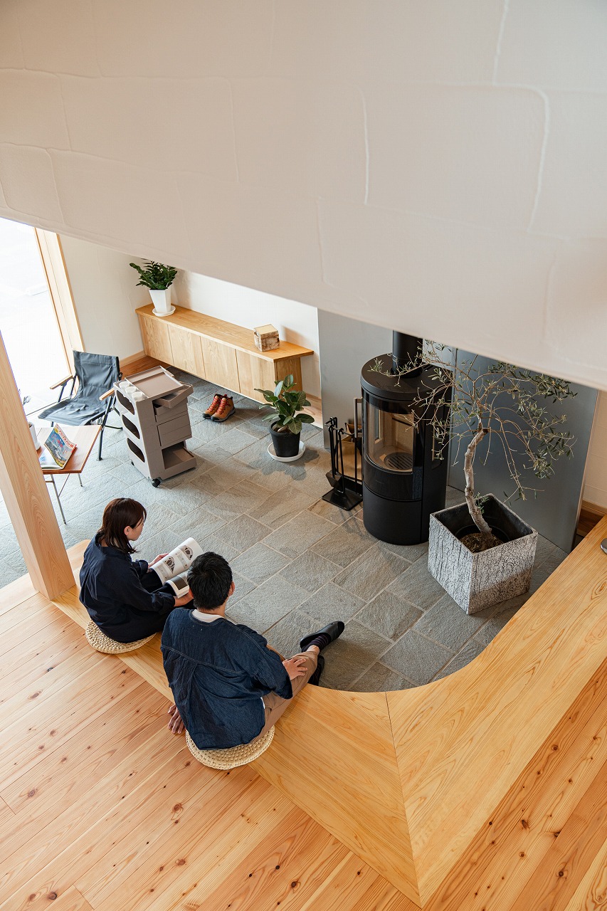 リビング続きのベンチに腰かけ、薪ストーブの炎を眺めながら語らう。冬は薪ストーブ1台で家中快適です。