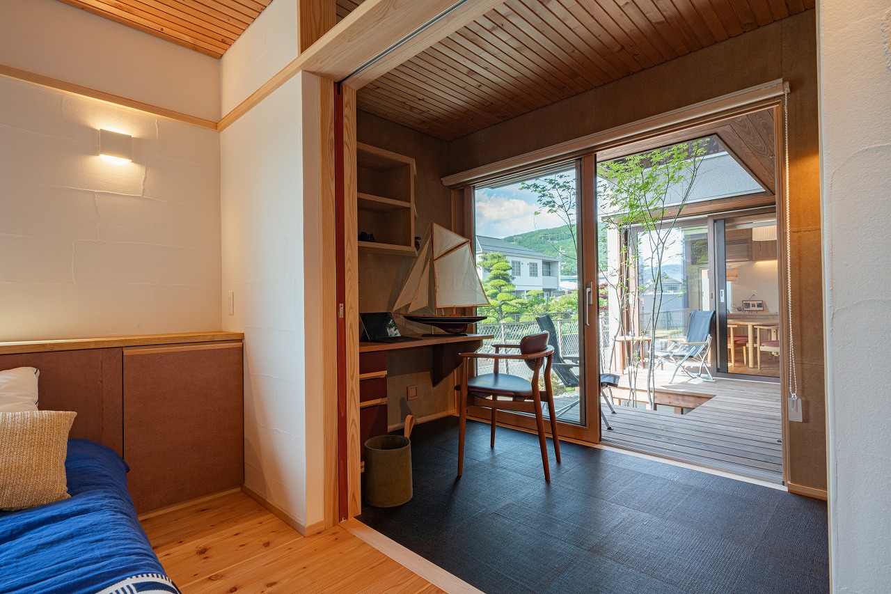 中庭に面したデッキと寝室の中間に書斎を設けました。家族や友達と過ごすだけでなく、一人の時間も心を満たしてくれる大切なひとときです。