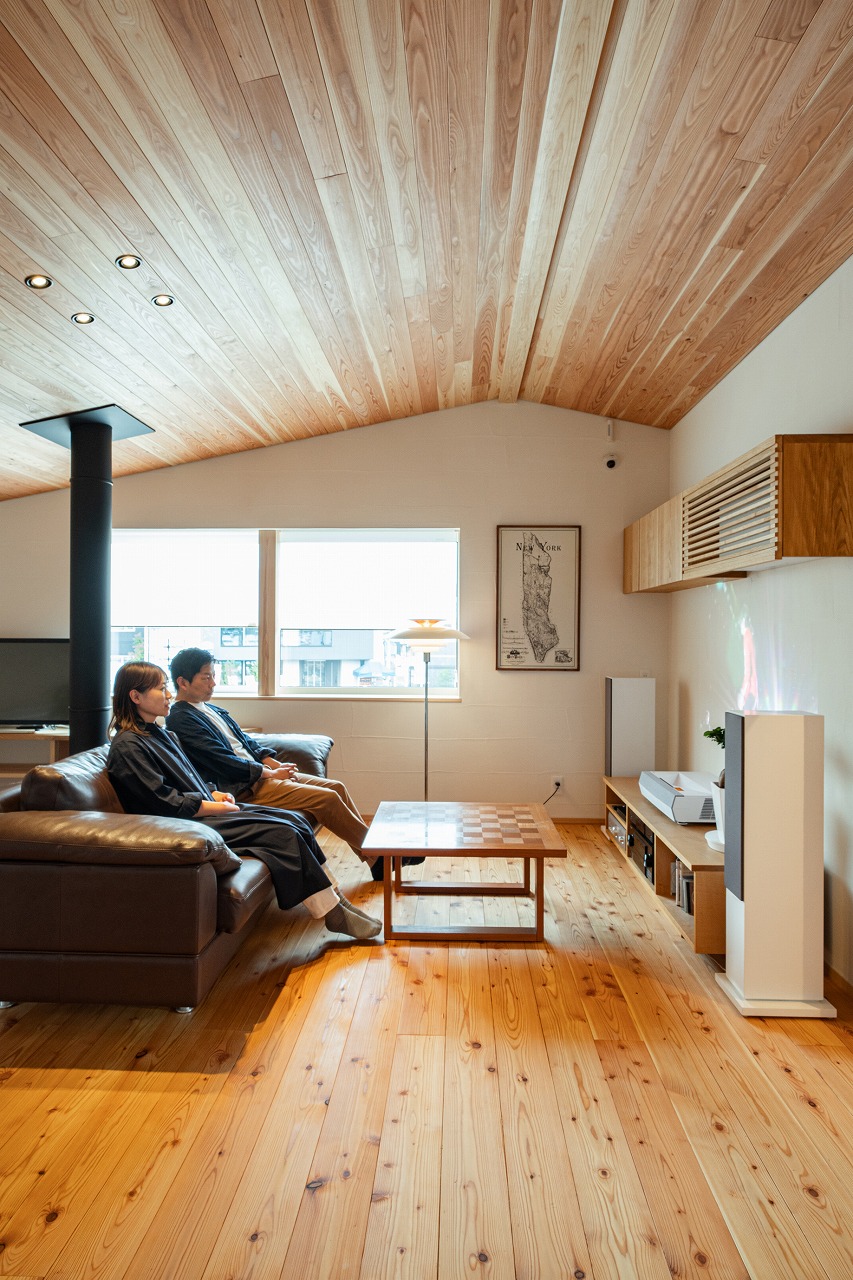 斜天井が落ち着きを生むフリースペース。シアターコーナーとしても。