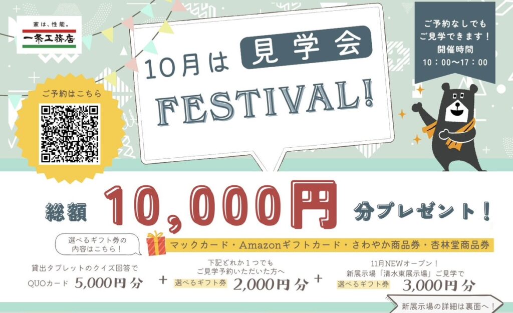 一条工務店★10月は選べる見学会フェスティバル!平屋、耐水害住宅、全館床冷房…ご希望に合わせて1カ所ご見学で、ギフトカードプレゼント!
