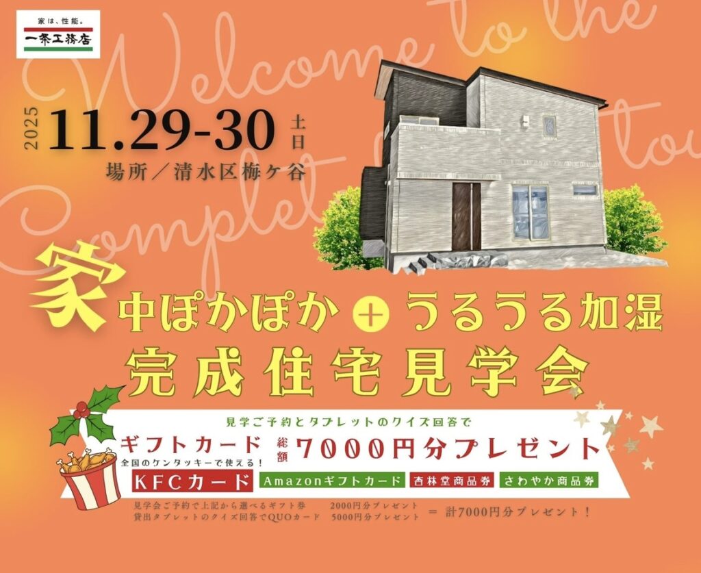 一条工務店★完成住宅見学会★11/29-30 「全館床暖房」×「全館うるケア」で、家中ポカポカうるうる♪【清水区梅ケ谷】ご予約で最大7000円分プレゼント!