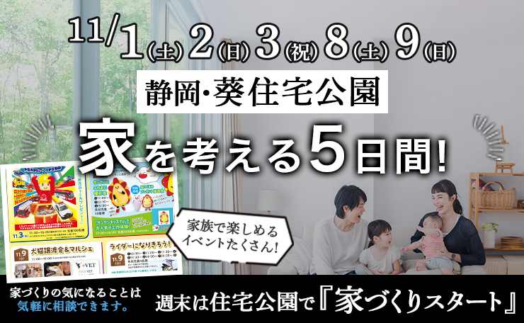 イベント一覧 静岡・葵 住宅公園イベント イベントを探す 全部見る お祭り・フェア モデルハウスのイベント 展示場のイベント 1件 日時:11/1(土)2(日)3(祝)8(土)9(日) ※週末限定イベント開催中10時半~17時 場所:静岡・葵住宅公園 家を考える5日間! in 静岡•葵住宅公園11/1.2.3.8.9の土日祝 もっと見る