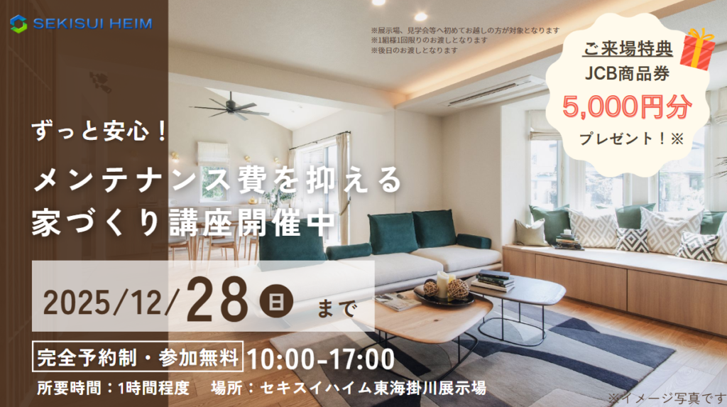 【セキスイハイム】メンテナンス費を抑える 家づくり講座開催中 JCBギフトカード最大¥5,000円分★プレゼント♪